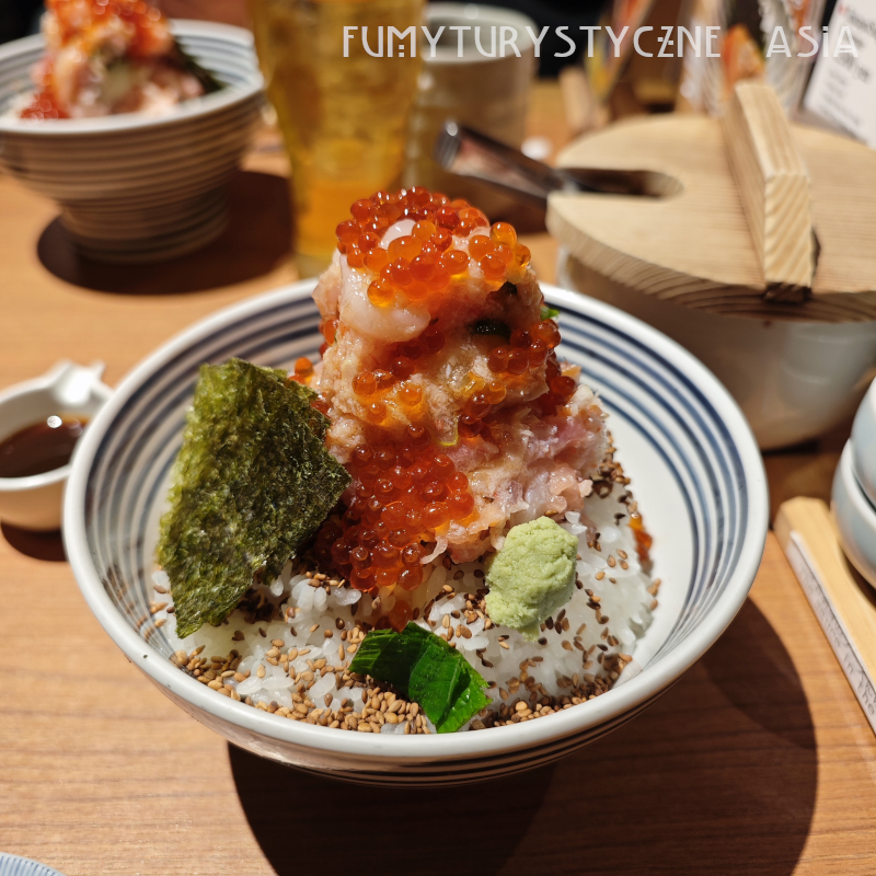 Żeby nowej świeckiej tradycji stało się zadość wybraliśmy miejsce z owocami morza na ryżu i lunch zjedliśmy w restauracji Tsujihan. Bardzo ciekawy sposób podawania – najpierw dostaje się cztery kawałki sashimi ale zalecane jest pozostawić sobie dwa kawałki na później. Dostajemy też miseczkę sosu sojowego wymieszanego z żółtkiem, do którego dodajemy wasabi wedle swojego uznania. Kiedy na stół wjeżdża miska z daniem głównym – ryżem a na nim mieszanką owoców morza (krewetki, tuńczyk, ślimak morski, krab) polewamy je tym sosem sojowym, mieszamy i zajadamy. Ale! Gdy osiągniemy 1/3 pozostałego dania w misce wołamy obsługę i do naszej miski zostaje dolany pyszny gęsty bulion, i wtedy do tego bulionu dorzucamy pozostałe dwa kawałki sashimi i kończymy obiad. *^V^*~~~ Było bardzo przepysznie!!!