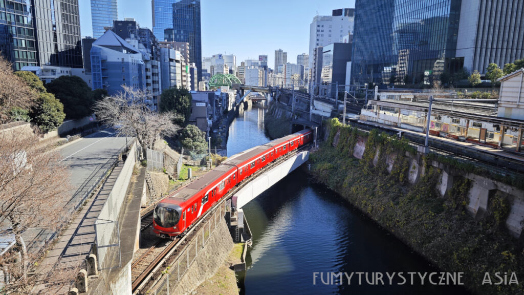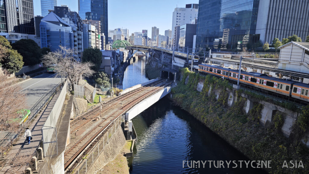 Marunouchi to ten czerwony :-). To jest metro i jeździ pod ziemią na całej trasie, ale tu na chwilkę wyskakuje pod otwarte niebo przekraczając rzekę Kanda. Najfajniej złapać Chuo (pomarańczowy), Chuo-Sobu (żółty) i Marunouchi na raz, i najlepiej jak te dwa pierwsze jadą każdy w inną stronę… Te pociągi śmigają tu co kilka minut maksymalnie więc nie jest to aż takie trudne. No ale widać nie mam cierpliwości.