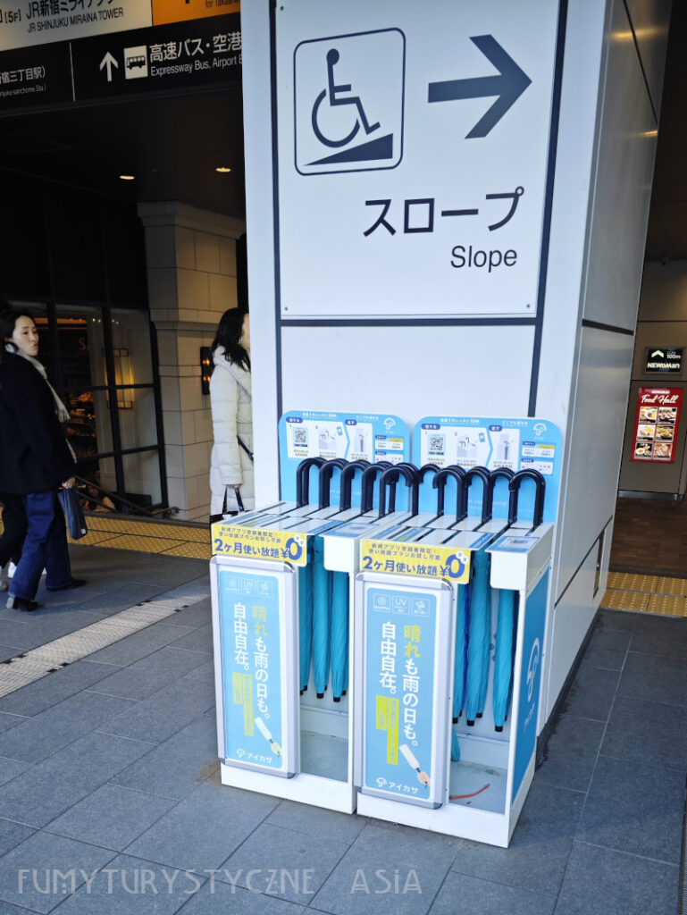 Ciekawostka – parasol sharing! (na jednej ze stacji kolejowych trafiliśmy też na spacerówki dziecęce do wynajęcia, bardzo mądre, jeśli nie chce się ciągnąć własnego wózka przez pół miasta, można wygodniej przejechać z dzieckiem pociągiem, w konbini można też wynająć powerbanka i doładować telefon).